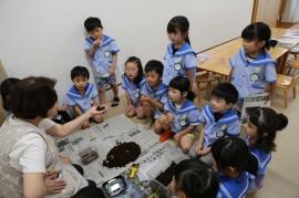 園の様子 カブト虫の幼虫 うさぎ・きりん組 卒園児さんからカブトムシの幼虫をいただきました。3・4歳児クラスで飼育、観察することになり、幼虫を実際に見て優しく手に乗せたりツンツンと触ってみたりしました。ふかふかの土のお布団に入れてあげ、霧吹きでシュッシュとお水をかけていましたよ。また、幼虫は今どんな状態かな?と、自ら図鑑を広げて調べる子ども達の姿もありました。 もどる