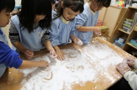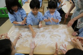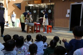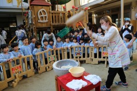 園の様子 食育活動 ~おもちつき~ 2025年12月11日(木) うさぎ・きりん・ぞう組 3~5歳児クラス(うさぎ・きりん・ぞう組)では、毎年恒例のおもちつき体験が行われました。子ども達は、掛け声に合わせて杵でぺったんぺったん、おもちをついてくれました。次第にもち米がおもちにかわっていく様子を、不思議そうに見ている子ども達。つき終わったおもちは、各クラスでクルクル丸めて鏡餅にしたりと楽しみました。 もどる