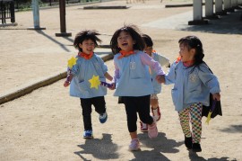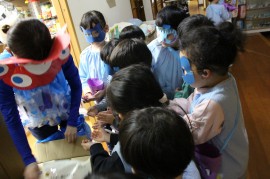 園の様子 ハロウィーン 2025年10月31日(金) 長楽保育園では、各クラスでハロウィーンにちなんだ保育を楽しんでいます。自分たちで作った衣装やお面を身にまとい、園内外へお菓子をもらいに行く子ども達。ちょっとドキドキしながらも一生懸命「トリックオアトリート」と発語していましたよ。 もどる